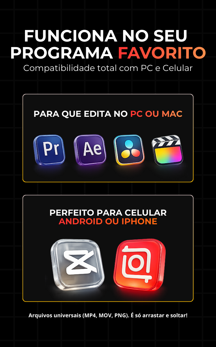 Com certeza. O Pack Edit Pro é compatível com qualquer software de edição do mercado, incluindo Premiere Pro, After Effects, DaVinci Resolve, Final Cut e CapCut para PC.